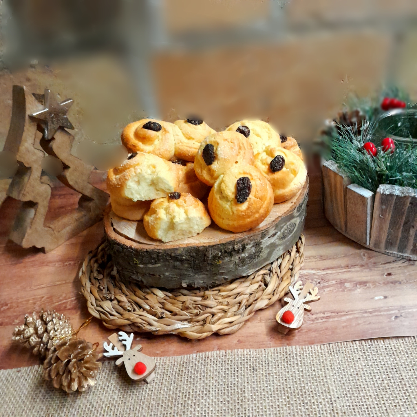 Versate in un pentolino il latte e fatelo riscaldare senza bollire, aggiungete lo strutto e fatelo sciogliere. Spegnete il fuoco ed unite i 120 gr. di zucchero, la buccia grattugiata del limone, il lievito, l'uovo e lo zafferano. Amalgamate bene con una frusta a mano, poi aggiungete la farina setacciata e fate riposare coperto per 15 minuti a temperatura ambiente. Adesso riprendete il composto, prelevate dei pezzetti di pasta e fate delle palline, poi stendetele in bastoncini lunghi circa 20 cm. Iniziate ad arrotolare prima da un lato e poi dall'altro formando delle piccole spirali (gli occhi), e nel mezzo di ognuno disponete un chicco di uvetta. Mettete i vostri biscotti su una teglia rivestita di carta forno, distanziandoli fra di loro per consentire di lievitare in cottura, spennellate la superficie con un po' di latte e spolverate di zucchero semolato. Cuocete in forno caldo a 170 gradi per circa 25 minuti.